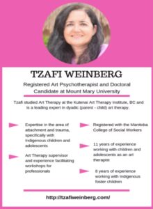 Tzafi Weinberg to teach the Art Therapy Studio class in February. Tzafi studied art therapy at the Kutenai Art Therapy Institute, BC, and currently is a Doctorate student at Mount Mary University, Milwaukee. She is knowledgeable in the area of attachment and trauma, specifically with Indigenous children and adolescents. She believes that Art therapy can contribute to the reconciliation process with Indigenous people.