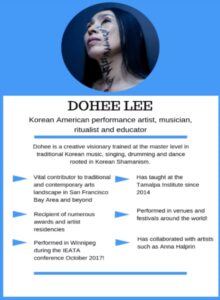The Expressive Arts Therapy Studio class (July 22-25) will have an exciting addition! Born on Jeju Island in South Korea, Dohee Lee studied Korean dance, music, percussion and vocals at the master level. Since her arrival in the US she has been a vital contributor to both the traditional and contemporary arts landscape of the San Francisco Bay Area and beyond. Dohee’s work focuses on integration of traditional forms and contemporary arts through music, movement, images, costumes and installation.