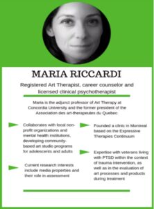 Maria Riccardi will be teaching the first year Art Therapy classes summer 2019. Maria is a registered art therapist, career counselor, licensed clinical psychotherapist and the former president of the Associationdes art-thérapeutes du Québec. She is an adjunct professor of art therapy at Concordia University and a part-time professor at l’Université du Québec in Abitibi-Témiscamingue. She collaborates with local non-profit organizations and mental health institutions, developing community-based art studio programs for adolescents and adults who are marginalized due to mental and physical health issues, immigration issues, and poverty. She has expertise with veterans living with combat-related post-traumatic stress disorder within the context of trauma intervention as well as in the evaluation of art processes and products during treatment. She has founded a clinic in Montreal based on the Expressive Therapies Continuum, providing educational and emotional support to children and families.