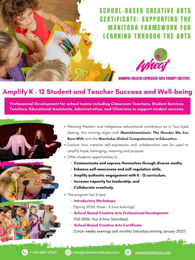 The 200-hour School-Based Creative Arts Certificate aligns with the International Expressive Arts Therapy Association’s (IEATA) requirement for Registered Expressive Arts Consultant/Educator (REACE) and the Ontario Expressive Arts Therapy Association’s (OEATA) requirement for Expressive Arts Practitioner. The certificate includes practice sessions and consultation with WHEAT faculty to directly support you and your team in integrating what you have learned into your school or classroom.