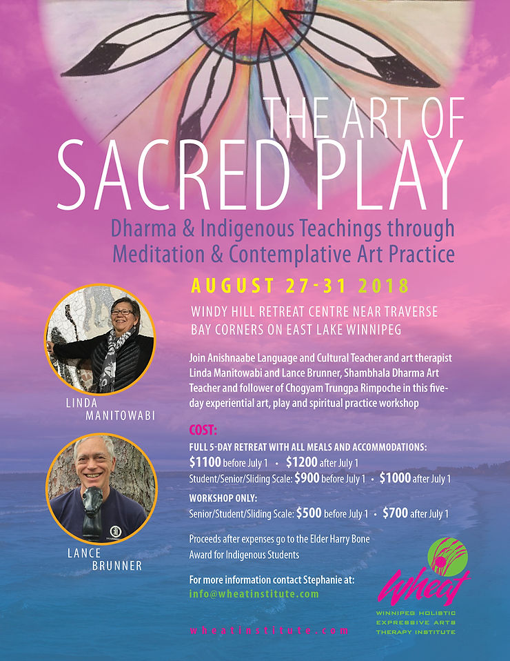 The Art of Sacred Play: Dharma & Indigenous Teachings Through Meditation & Contemplative Art Practice will be offered August 27-31, 2018 at Windy Hill Retreat Centre (near Traverse Bay Corners on East Lake Winnipeg). Participants will be immersed in the Indigenous Anishinaabe and Shambhala-Buddhist worldviews through art-making and experiential learning – being guided through prayer, meditation and contemplative art activities in music, calligraphy, movement and poetry.