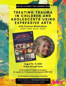 The dedication in my book, “Expressive Arts Therapy for Traumatized Children and Adolescents” reads, “To each child who taught me what it means to do brave therapy.” The learning with the young people I have journeyed with over the last 25 years culminated in the writing of this book. What stands out for me to this day, is the courage and the bravery it took from each child and teen to enter into the realm of healing the trauma wounds. I believe it is the medicine of the expressive arts that provides young people with the tools to cope, to ease the suffering, to make sense of and live with their transformed stories. I look so forward to sharing their stories of bravery this summer with those who attend my course in August!