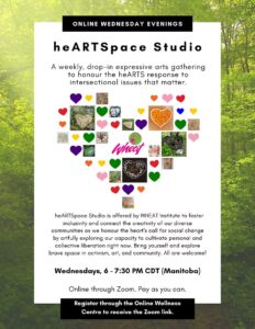heARTSpace Studio is a weekly, drop-in expressive arts gathering to honour the heARTS response to intersectional issues that matter. It is offered by WHEAT to foster inclusivity and connect the creativity of our diverse communities as we honour the heart’s call for social change by artfully exploring our capacity to cultivate personal and collective liberation right now. What is worth arting for?