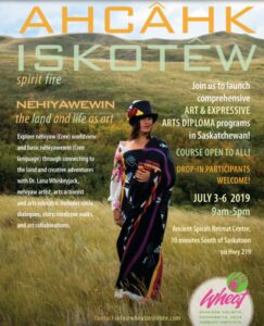 If you have been waiting for the opportunity to become an art or expressive arts therapist or consultant/educator in Saskatchewan, the time is now! With thirty acres of trees and rolling hills, on the banks of the majestic South Saskatchewan River, Ancient Spirals Retreat beckons you to learn in residence on the land, just 10 minutes south of Saskatoon. We are excited and grateful to welcome Cree teachers Dr. Lana Whiskeyjack (Nȇhiyawewin, the land and life as art – poster below); Bill Cook (Cree language teacher); and Kevin Lewis (Cultural Immersion teacher at Cultural Immersion at Kâniyâsihk Culture Camp, Island Lake, Saskatchewan).